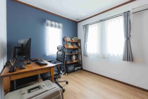 ワークスペースの防音ポイント: – リビングから独立した個室として設計 – 防音ドアと厚めの壁(石膏ボード二重貼り)で遮音性向上 – 窓を小さめにするか、内窓を追加 – 吸音材を壁や天井に仕込む