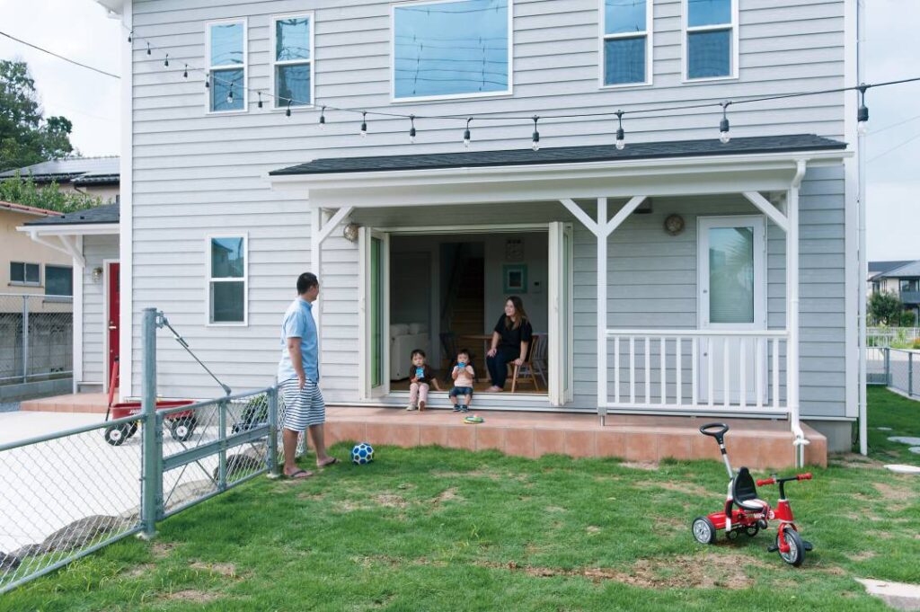 お施主様の声では「子どもたちへの目が行き届くこと」「風通しもよく、とても快適な住み心地」が挙げられています。カバードポーチでは子供のプールを置いたり、家族でくつろいだりと、年間を通じて活用されているそうです。