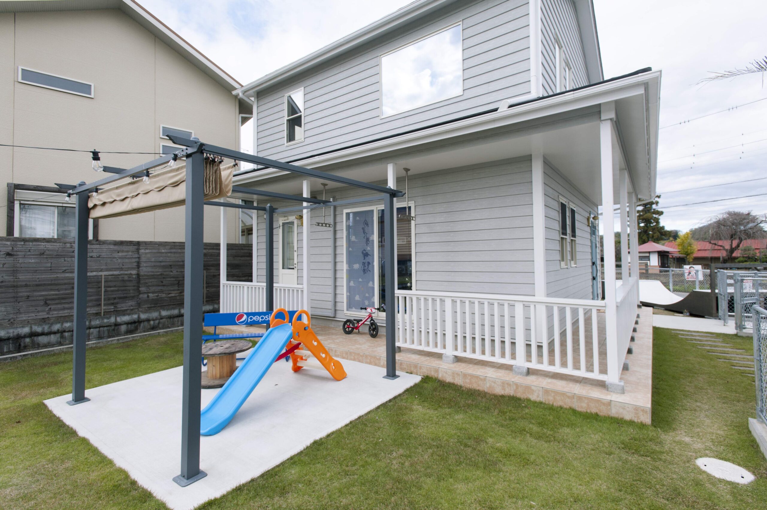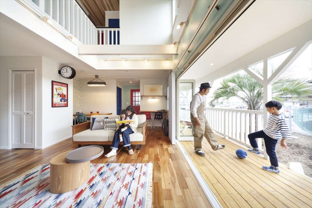 施主さまは「大好きなロカビリーの似合うアメリカンハウスの夢が叶った」と語り、デッキまで含めた広々としたLDKで、子供たちが自由に遊べる環境を楽しんでいらっしゃいます。