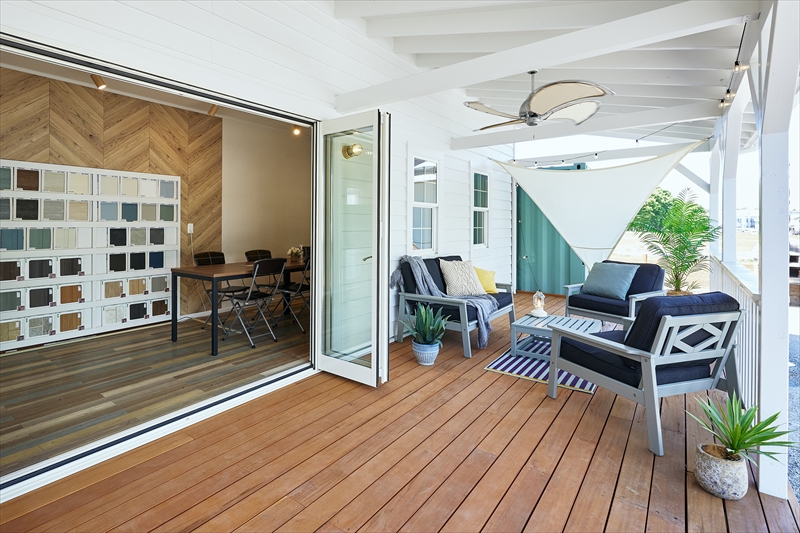 折れ戸やスライディングドアなどの窓を全開できるサッシを選ぶことで、開け放った時にリビングとデッキを完全に一体化できます。