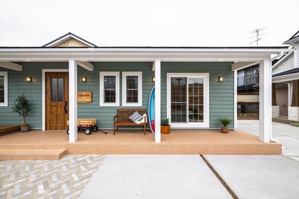 2.平屋アメリカン:カバードポーチで室内から庭まで見守る暮らし