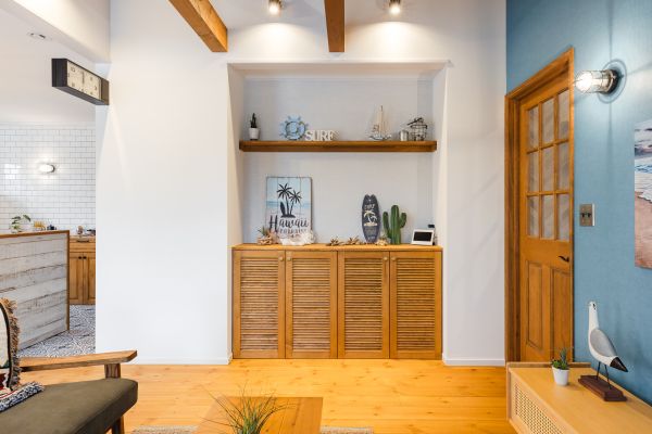 「ガレージは人生の中心」という価値観を軸に、居住空間とガレージを一体的に計画した住まい。日常動線の中にガレージを組み込み、暮らしと趣味が自然につながる設計です。内装はアースカラーを基調としたモダンな空間。玄関・階段ホールにはコファード天井とオーク材の階段を採用し、落ち着きのある上質な印象に。家族の時間と個人のこだわりが心地よく共存します。