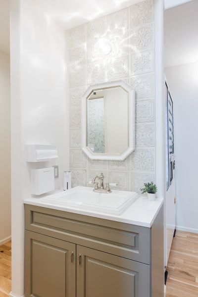 端正なシンメトリーが美しい平屋のモデルハウスです。爽快なオーシャングリーンの外壁とホワイトのコントラストは、まるで海辺のリゾート。深い庇の下のウッドデッキ(カバードポーチ)は、内と外を融合させるセカンドリビング。家族が自然と集い、BBQやアウトドアを楽しめる、暮らしを豊かにする開放的な居場所です。